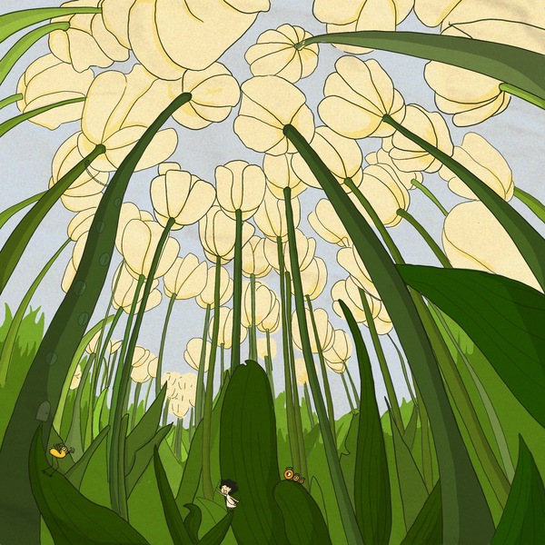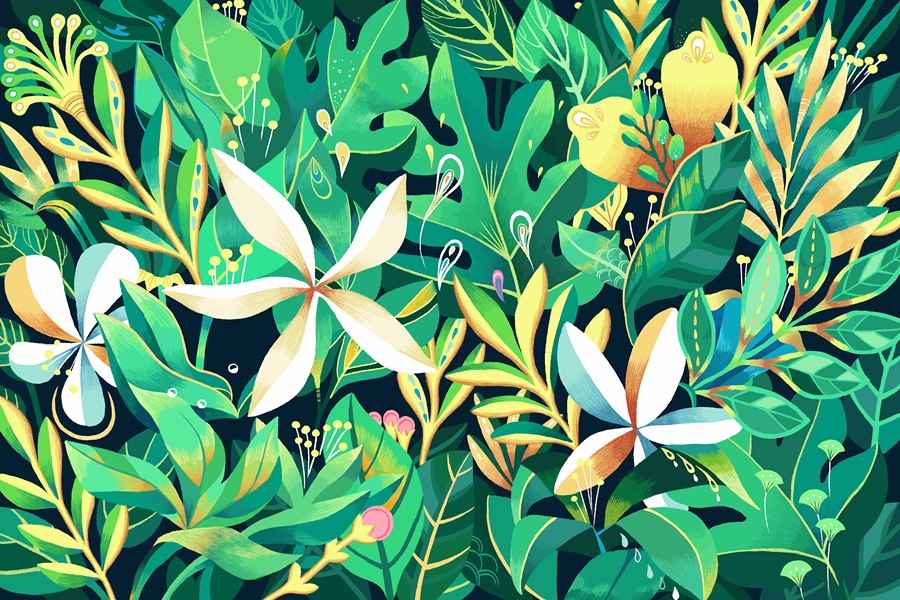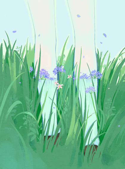 脚踏翠绿与花朵的夏/韩逛品牌插画
