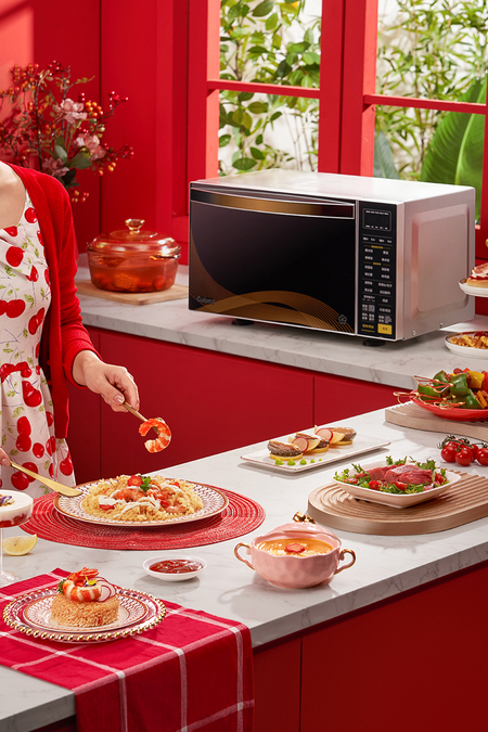 中国红实景小家电微波炉拍摄