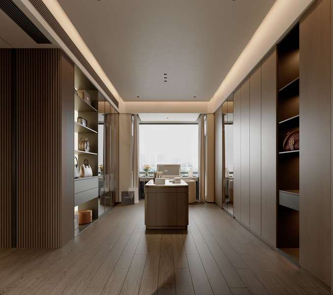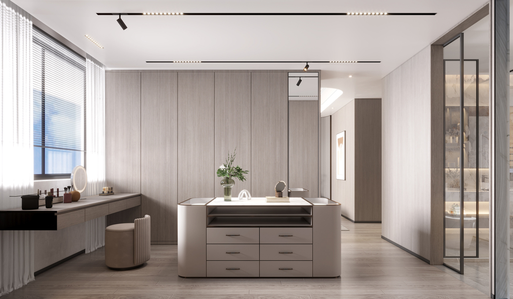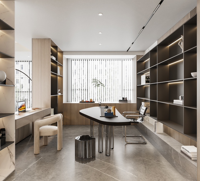 侘寂风奶油茶色别墅带庭院样板房效果图