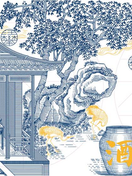 唐文人饮酒版画/酒包装插画设计/国风插画