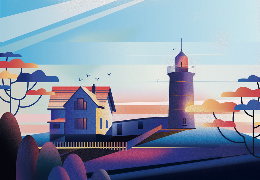静谧村庄渐变色噪点质感插画