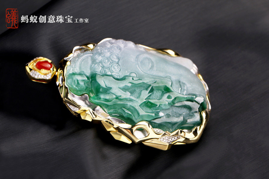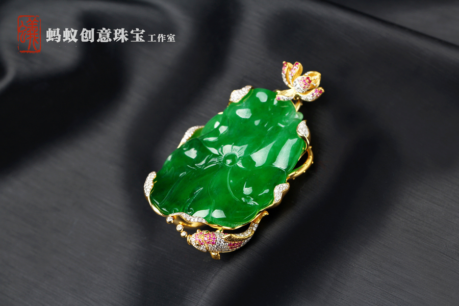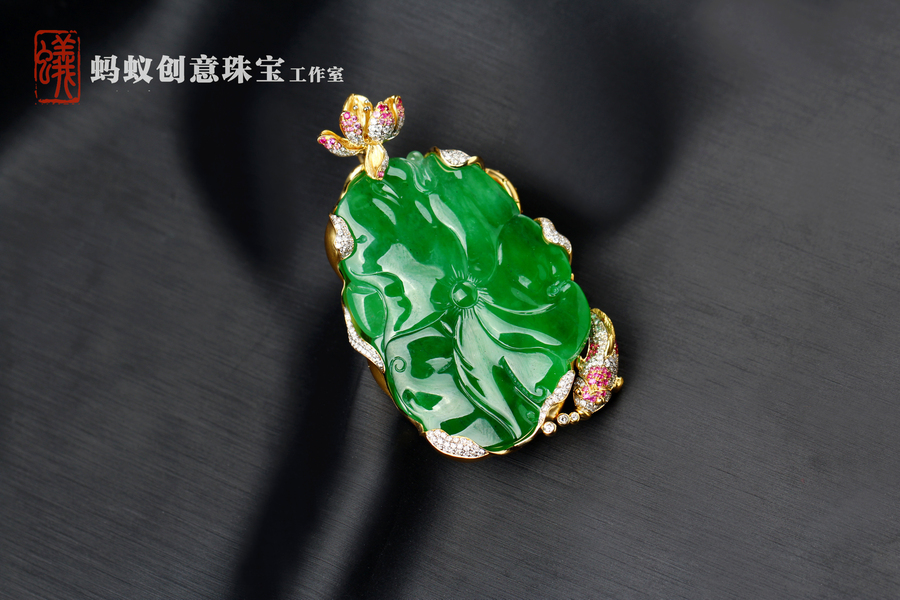 【蚂蚁创意珠宝工作室】K金镶嵌翡翠荷叶吊坠