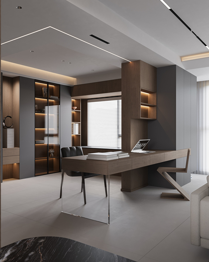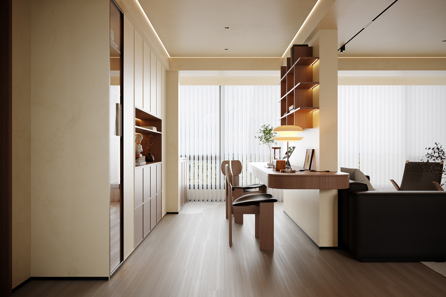 侘寂风奶油茶色别墅带庭院样板房效果图