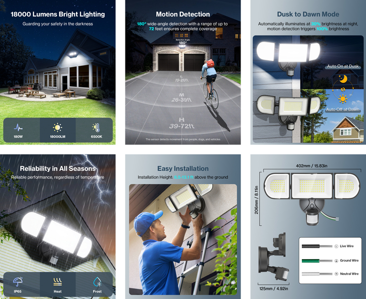 亚马逊180W三头人体感应光感壁灯主图A+套图