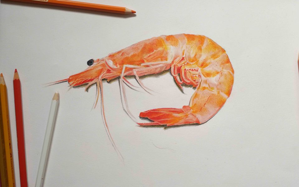 彩铅手绘食物。苹果。虾。面。真好的一餐。
