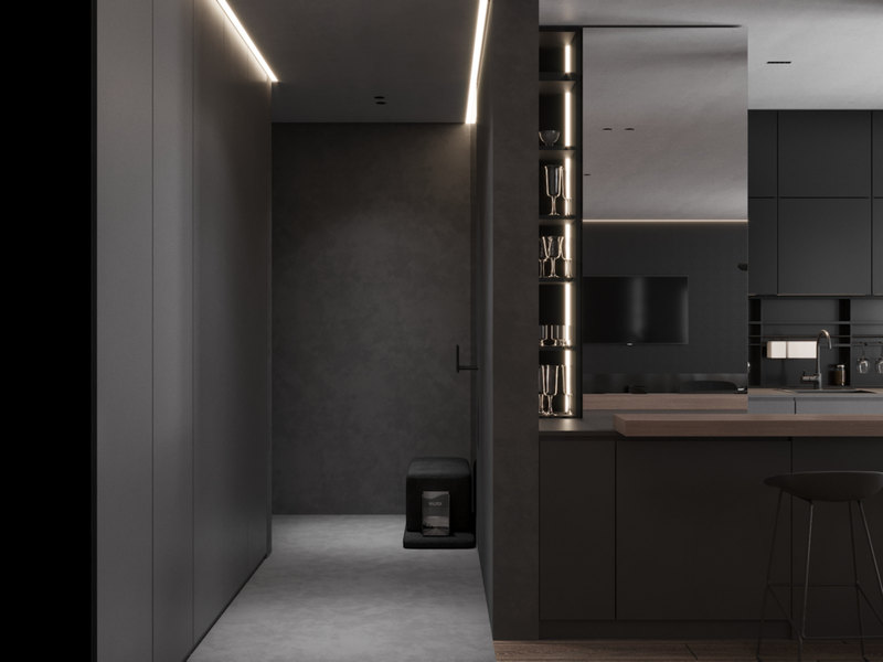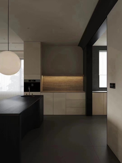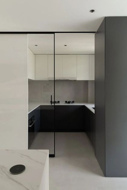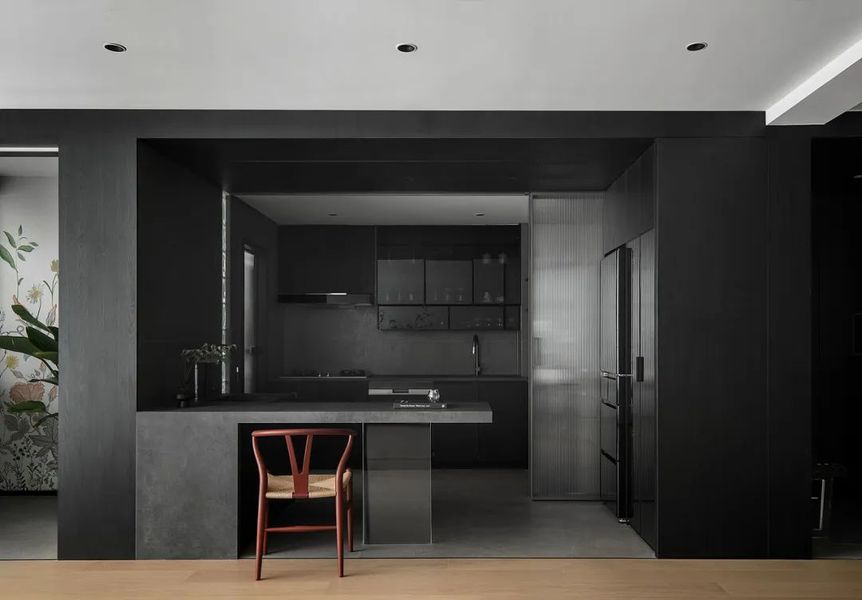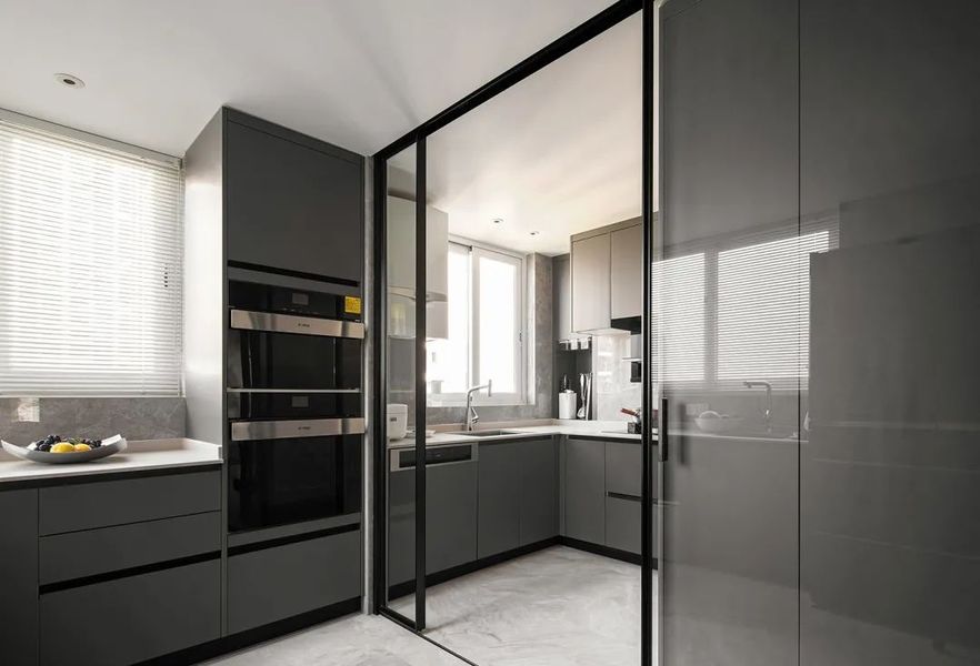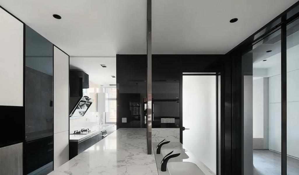 中西厨透明黑框玻璃门、主卧木色衣帽间,超有格调!