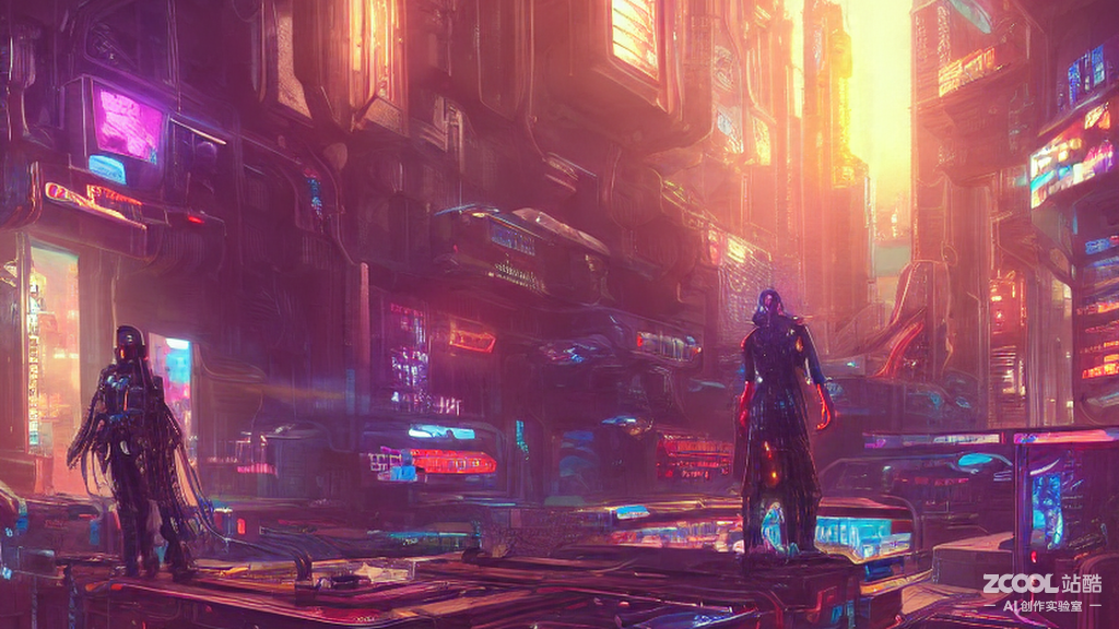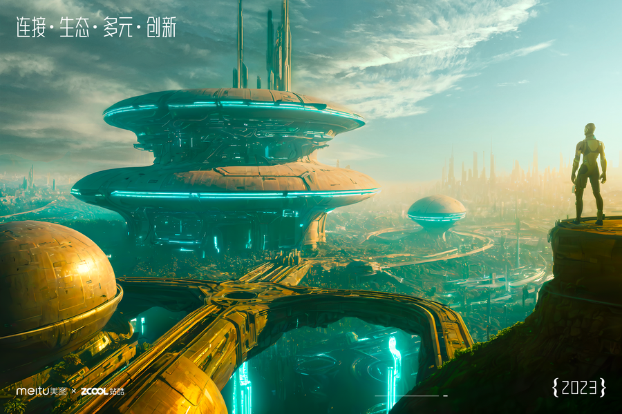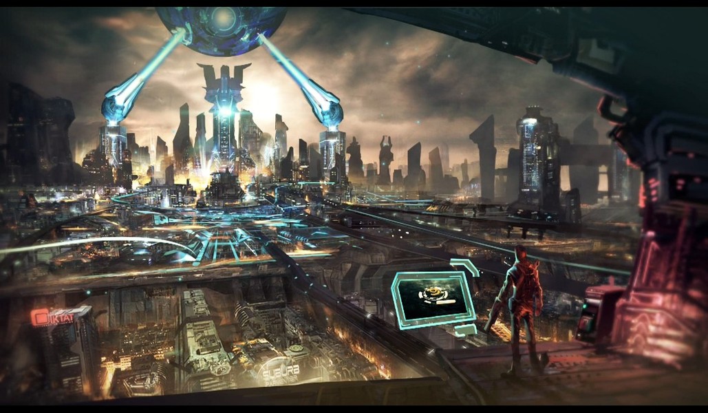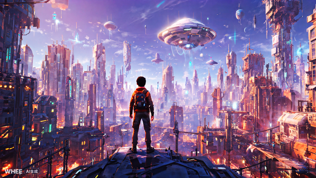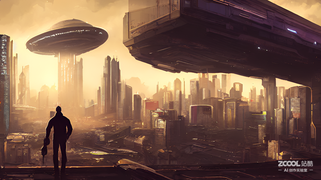 一座巨大赛博朋克城市前,天空还有艘巨大的外星飞船