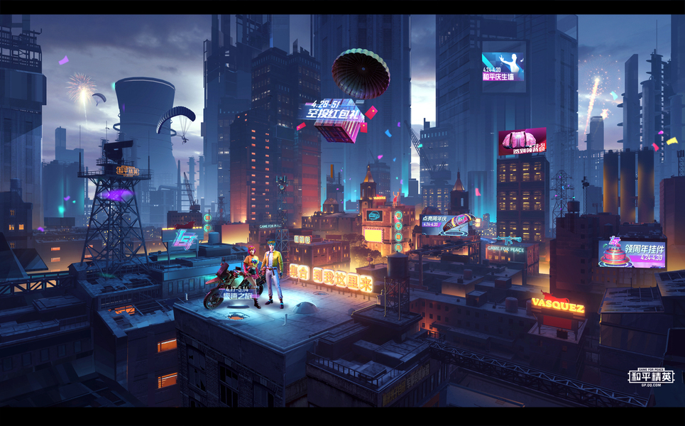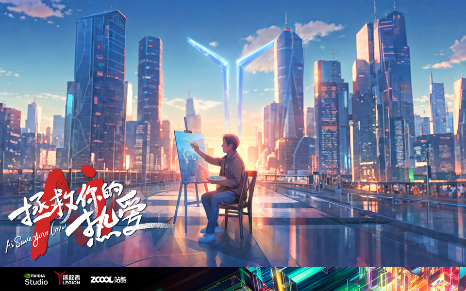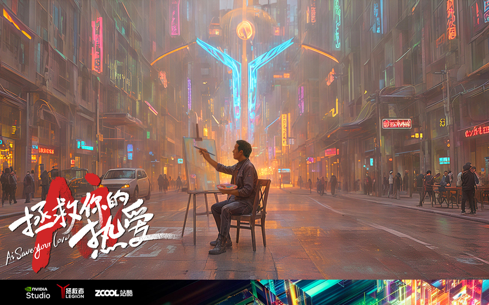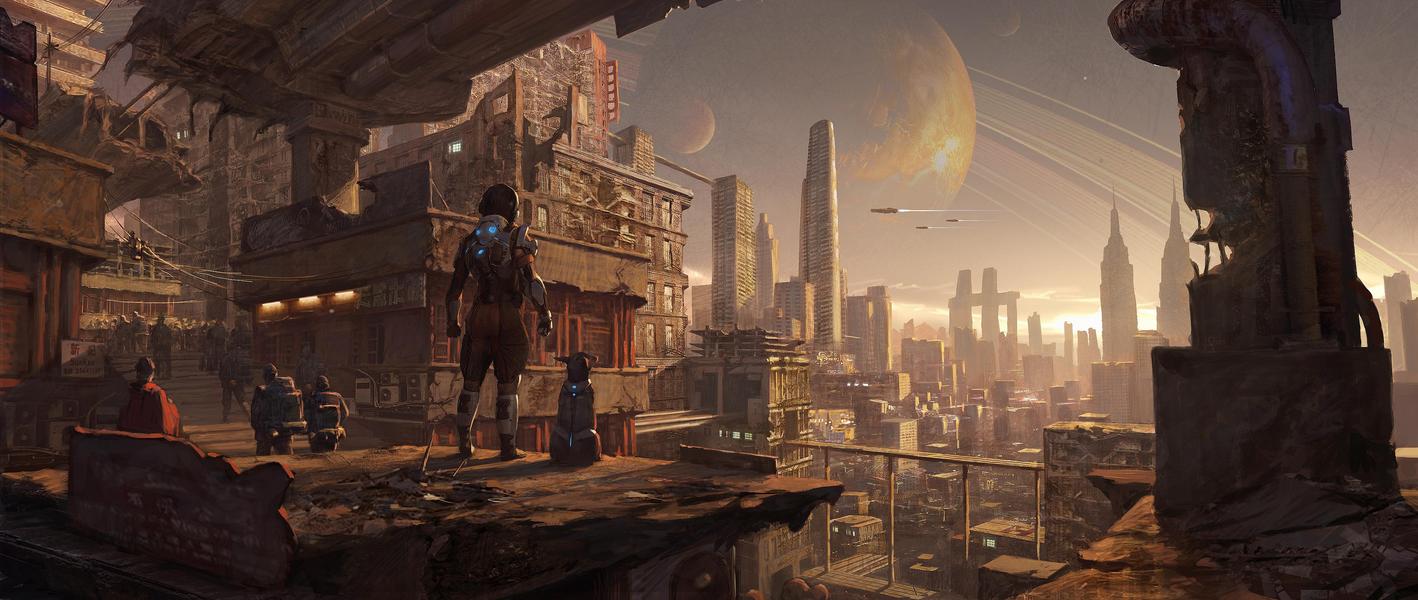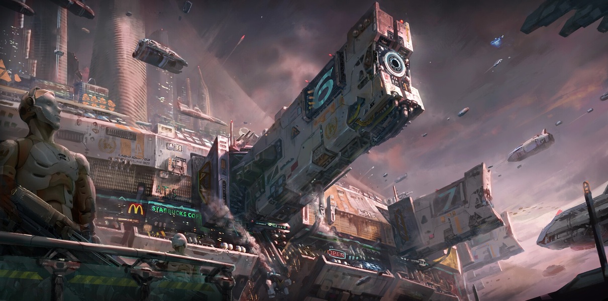 一座巨大赛博朋克城市前,天空还有艘巨大的外星飞船