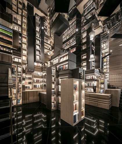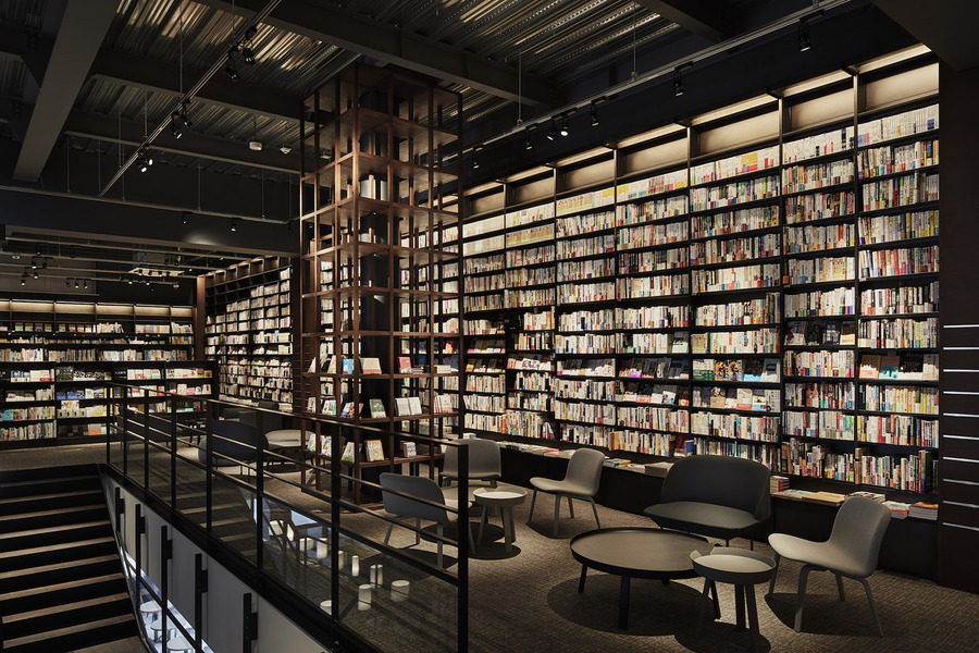 以书店为焦点,分布在其周围的店铺使用了相同色调