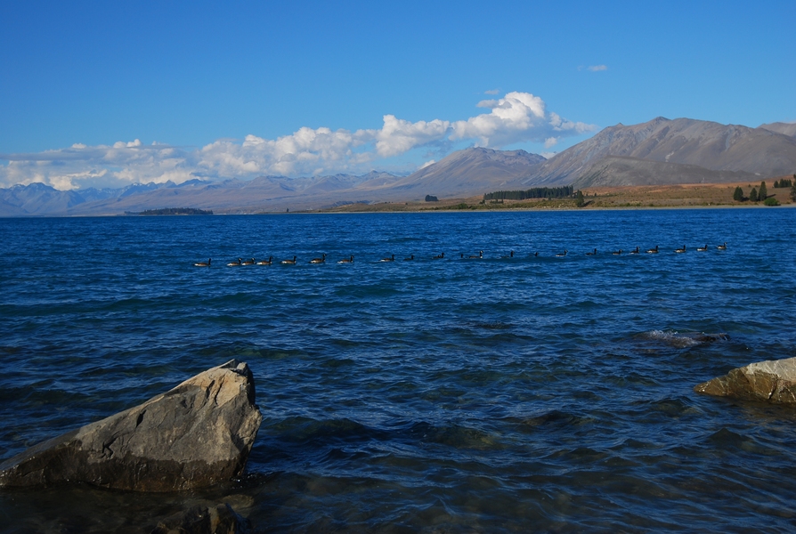 新西兰南岛 特卡波湖 好牧羊人教堂 山 湖 石头 铜像