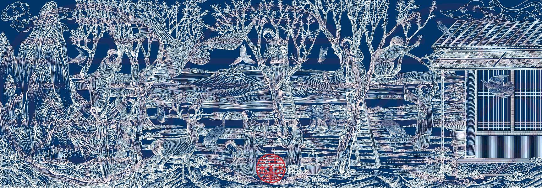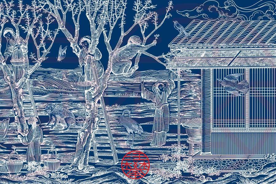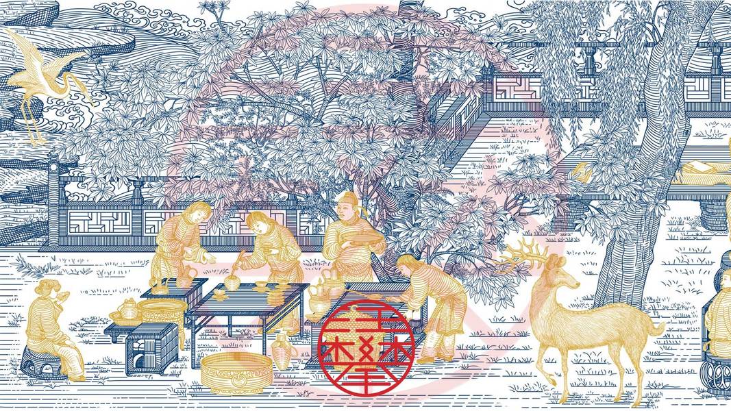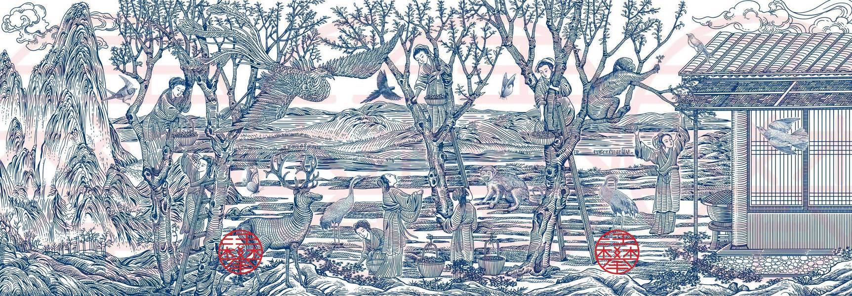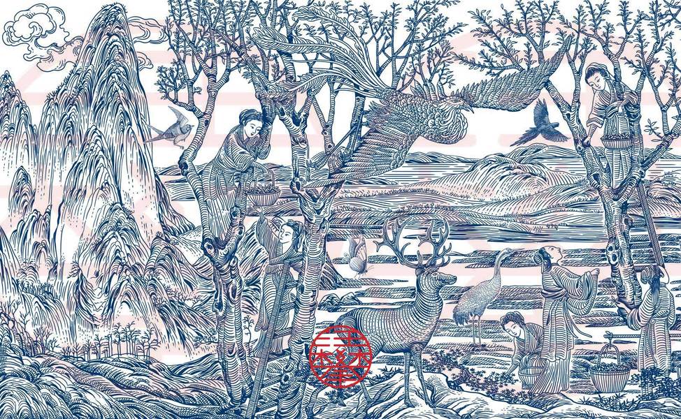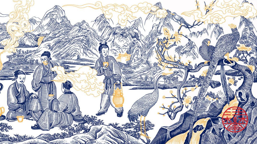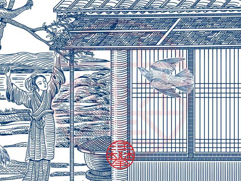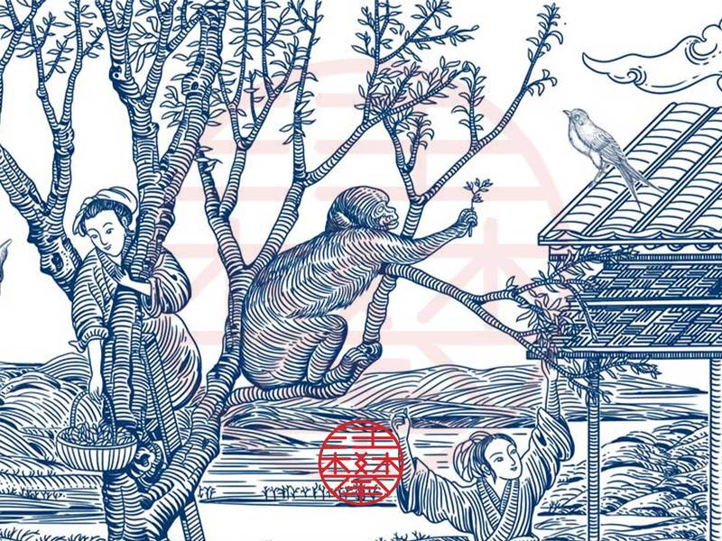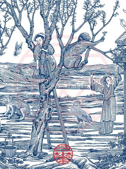 凤凰鹿猴丽人|采茶图版画|茶叶包装插画