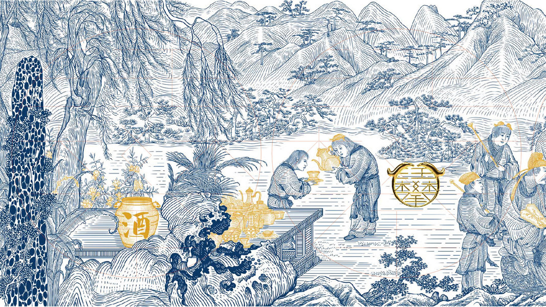 唐文人饮酒版画/酒包装插画设计/国风插画