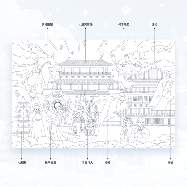 龙门石窟全景图形创意,线描图形