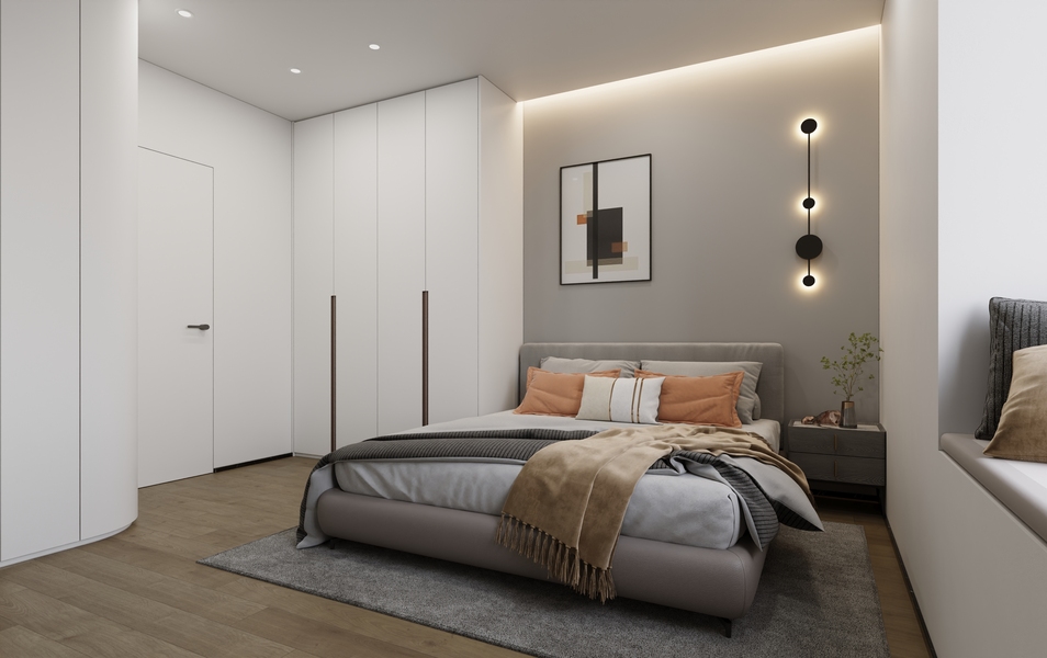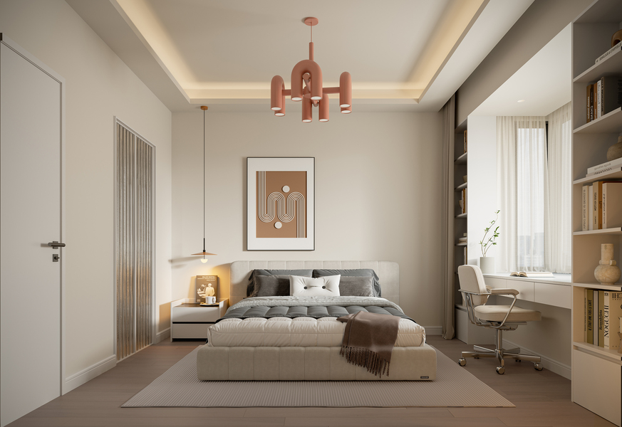 深圳口山设计:麒麟花园现代简约奶油风,一抹橙色新意