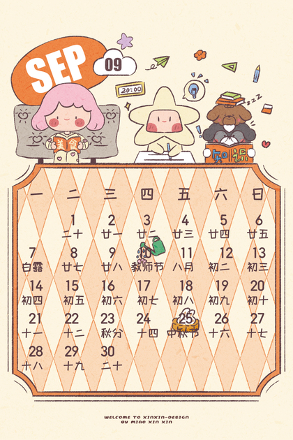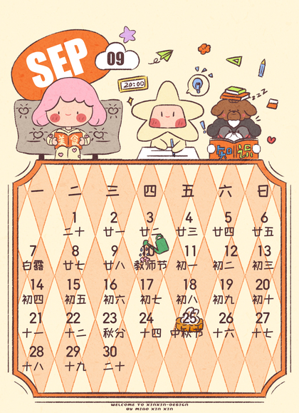 闪闪家族2026年9月份哒卡片日历