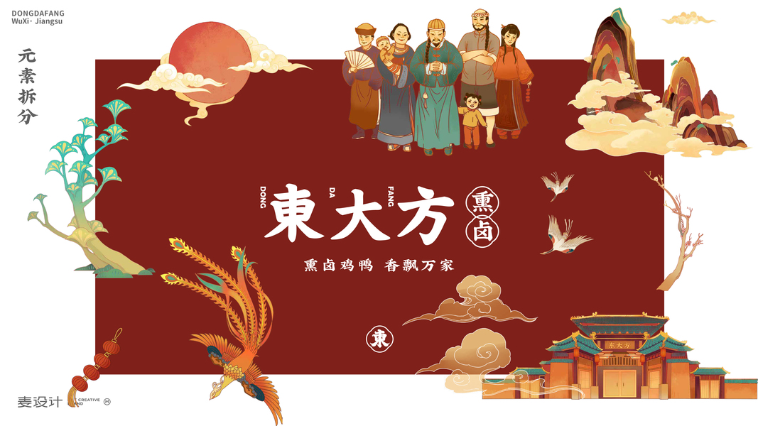 东大方熏卤传统包装插画,国风礼盒设计,新年团圆