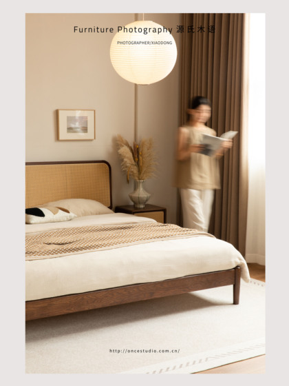 侘寂风胡桃木色实木床详情页 | 家具摄影