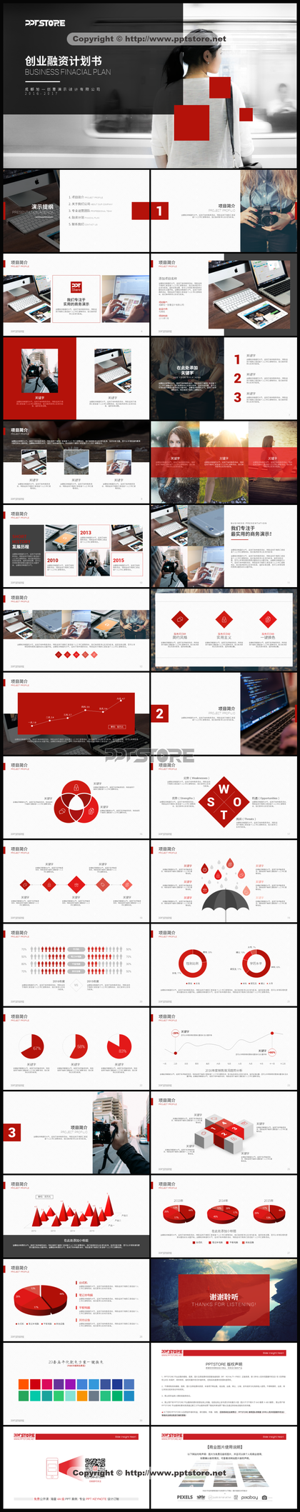 【中文】清新商业计划书模板(红+蓝+占位符)