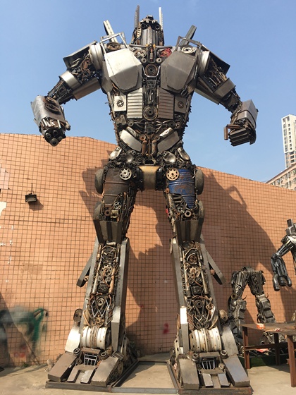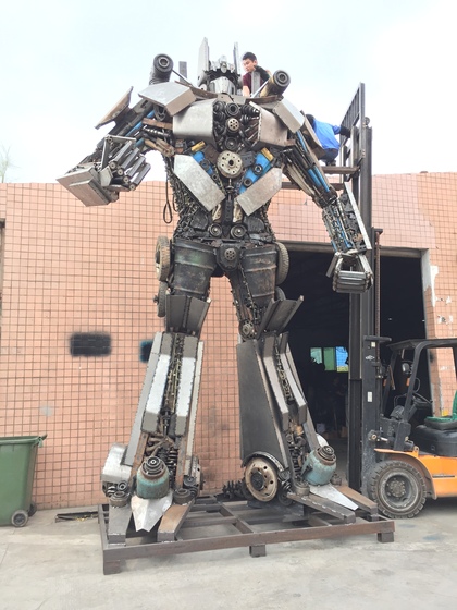废旧汽车配件,废旧摩托车配件焊接成的变4版擎天柱-变2版擎天柱