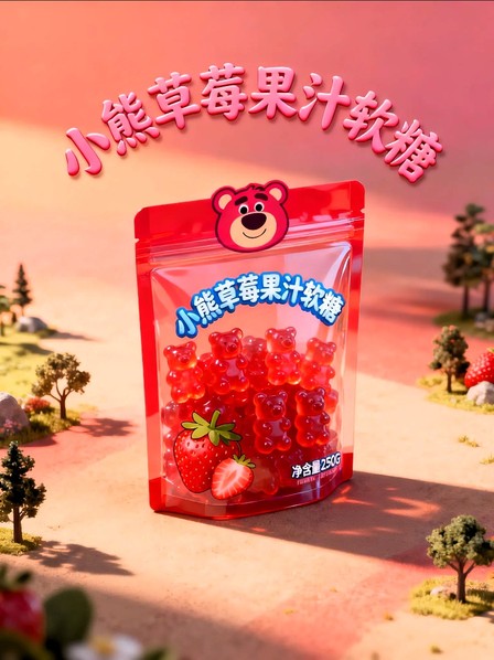 既梦AI设计小熊多种口味果汁软糖产品包装海报设计
