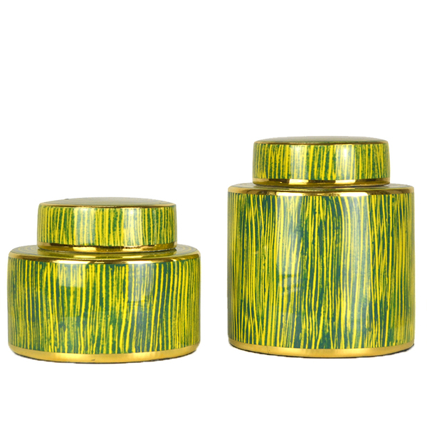 星派家居-轻奢现代简约黄绿竖纹色新中式陶瓷装饰罐