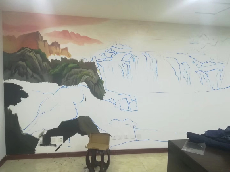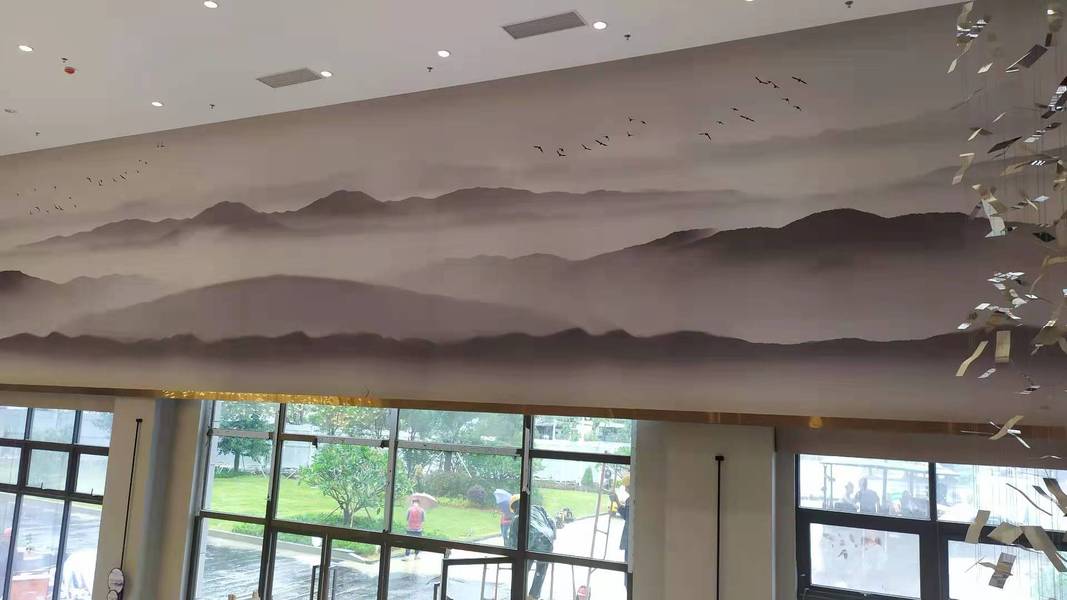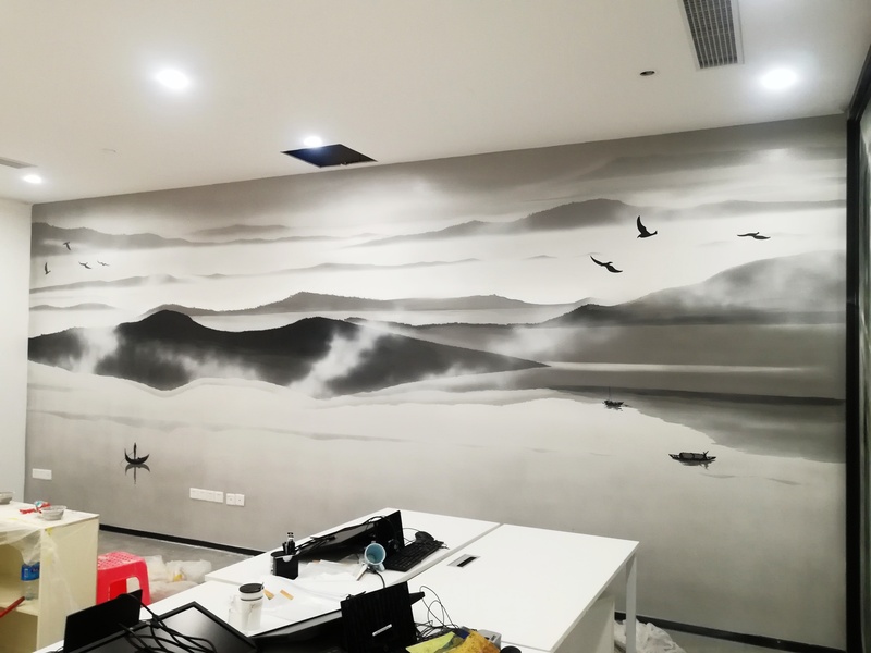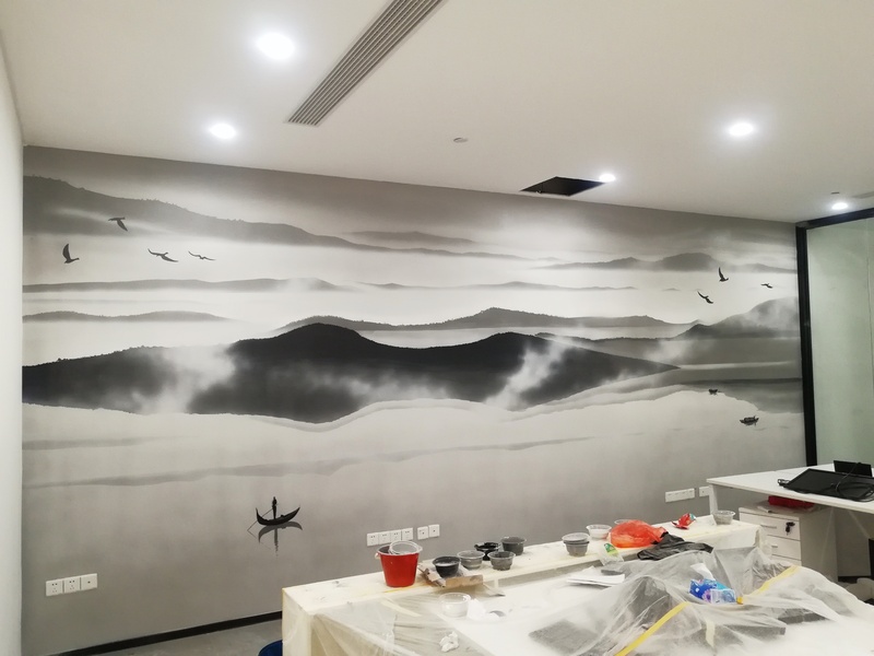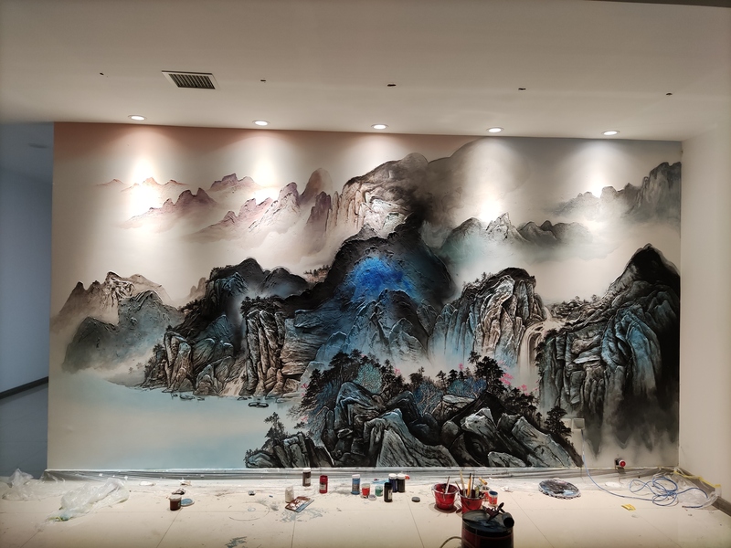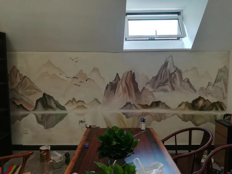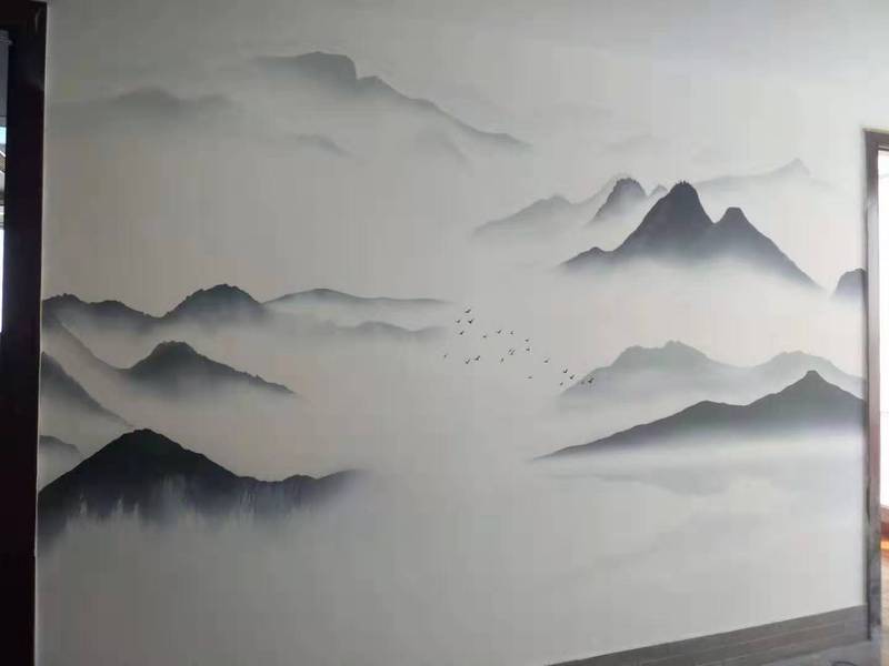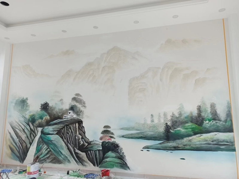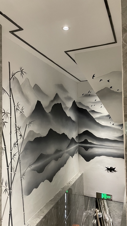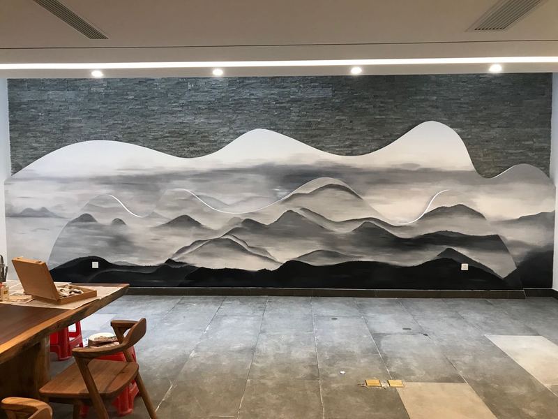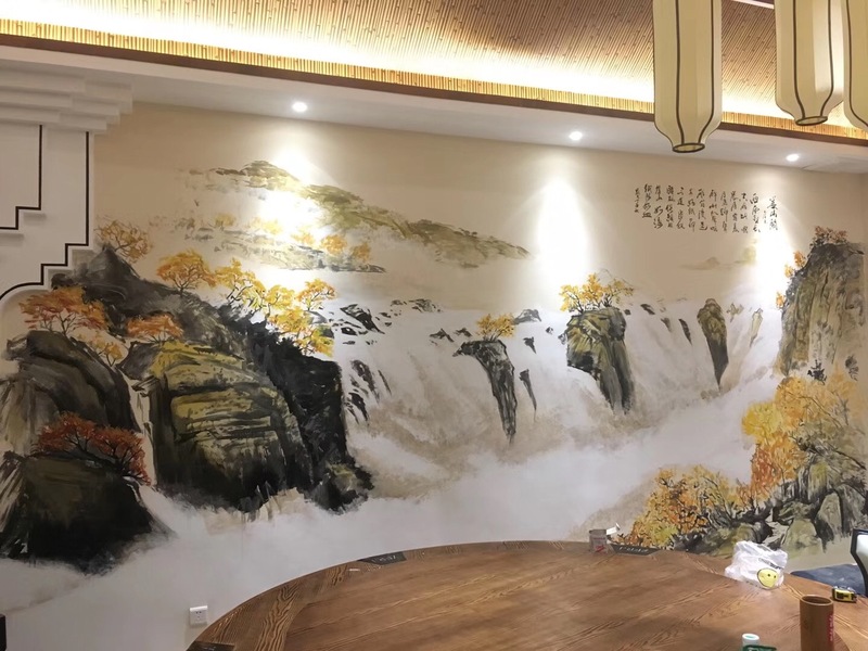 墙体彩绘 客厅背景墙山水壁画 墙体壁画 手绘墙 新中式