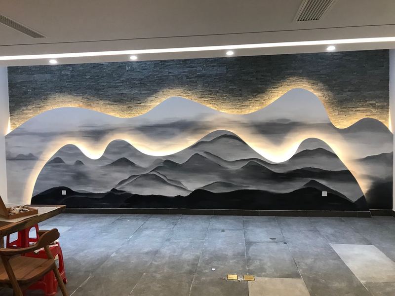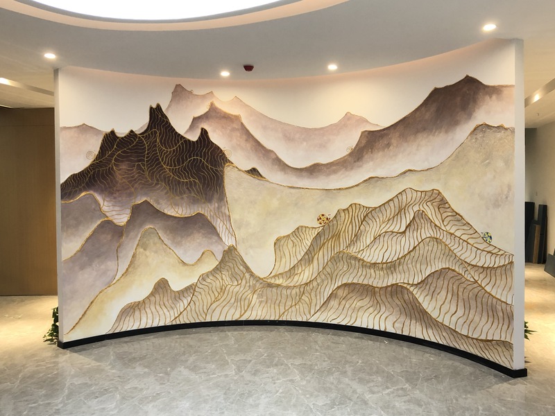 餐饮公司办公室端景墙浮雕山水墙绘壁画