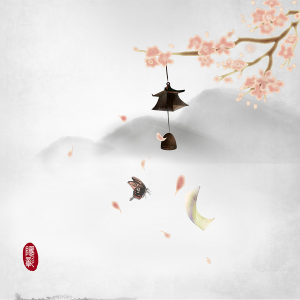 古风春分春天四季桃枝桃花花瓣24节气风铃古铃铛静物