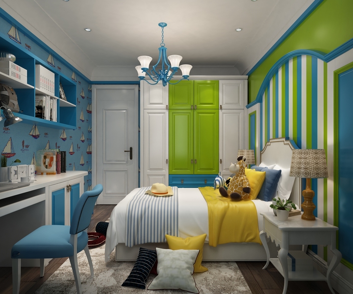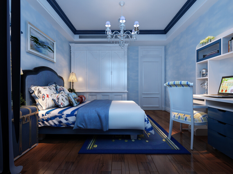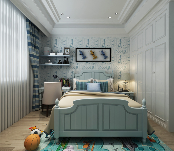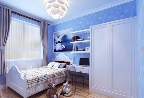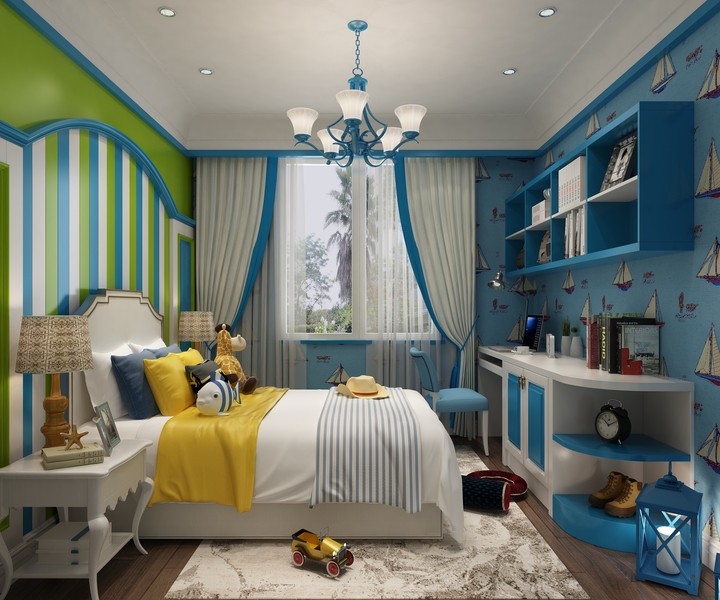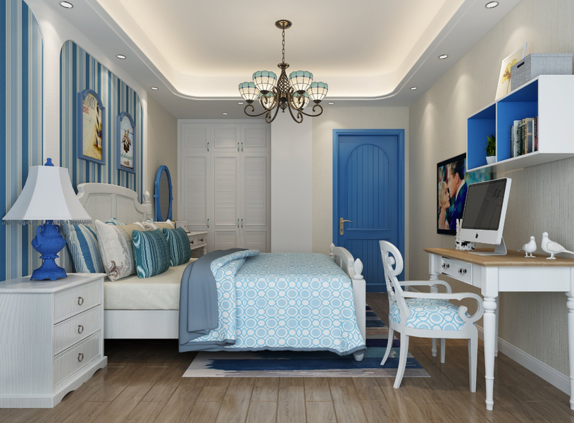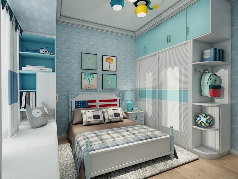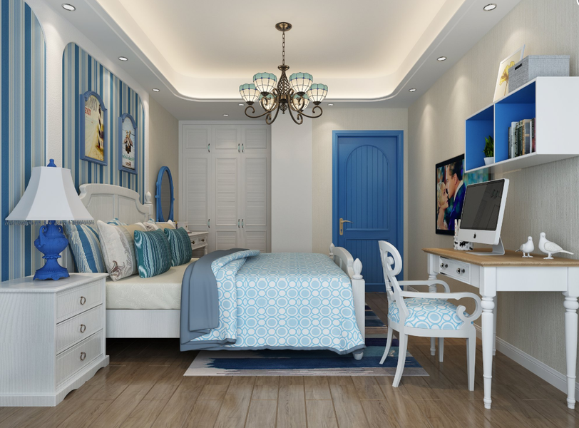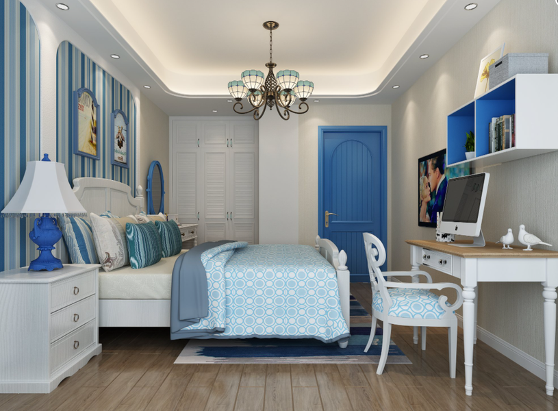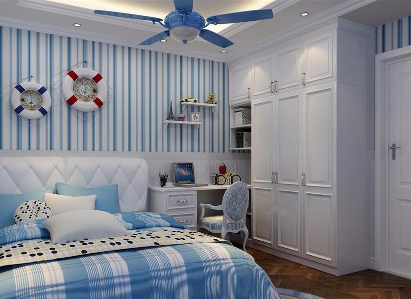 10㎡地中海风格儿童房设计效果图,衣柜和书桌转角一体
