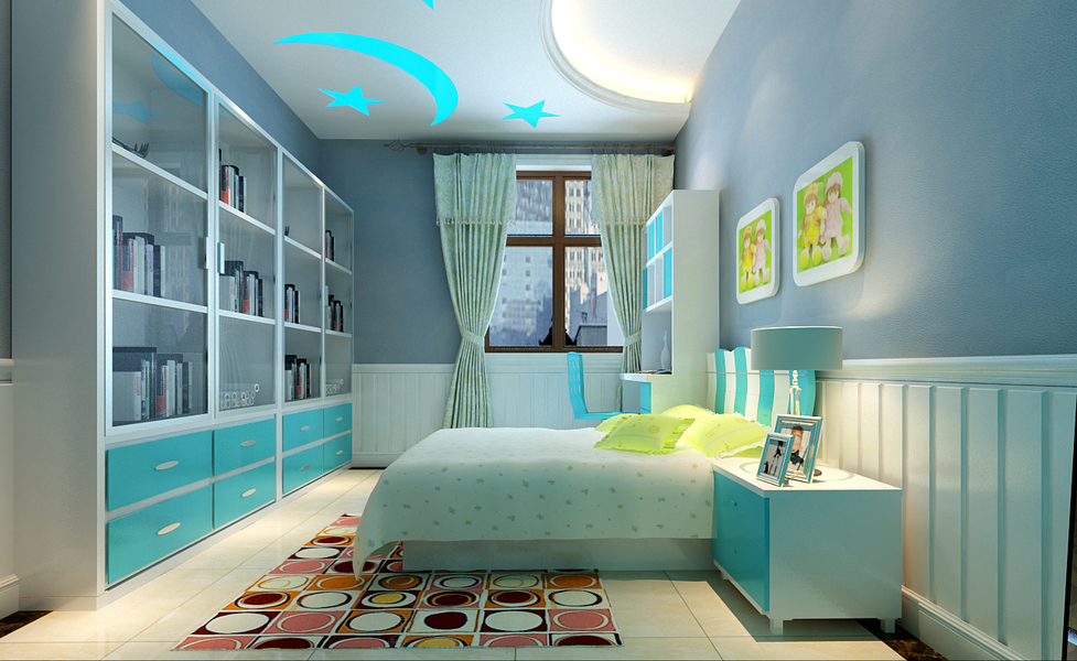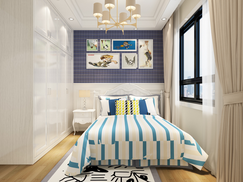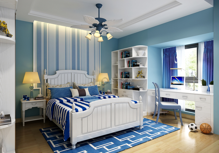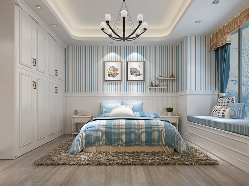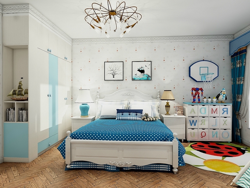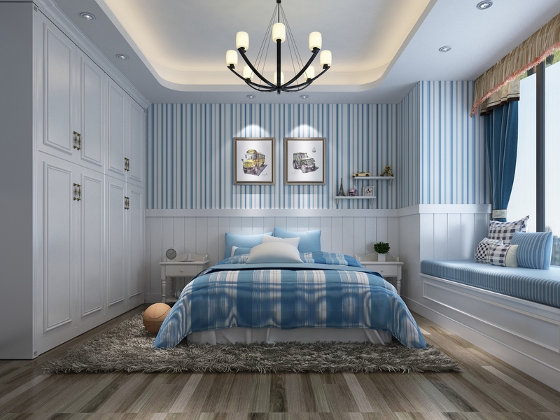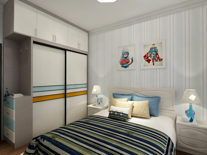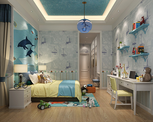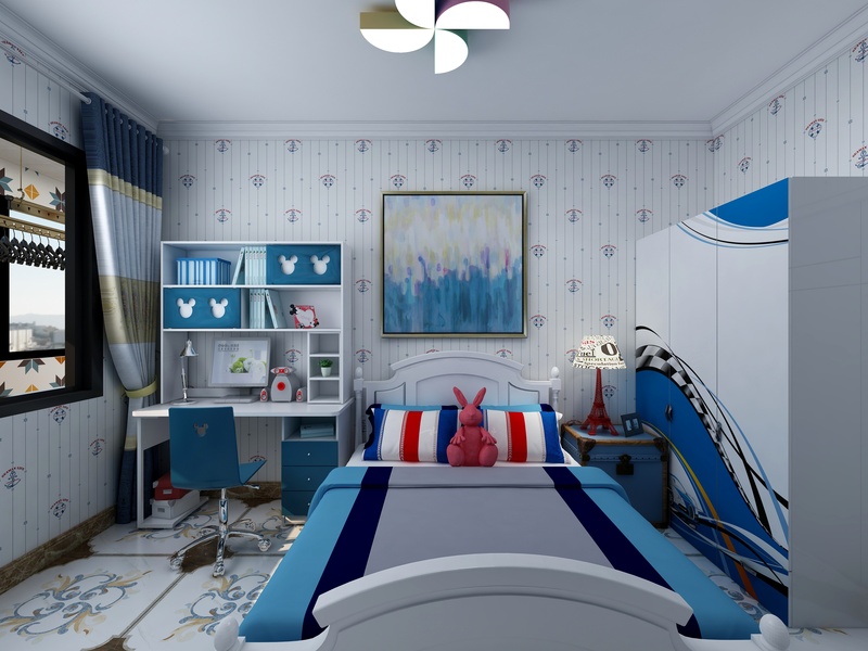 10㎡地中海风格儿童房设计效果图,衣柜和书桌转角一体