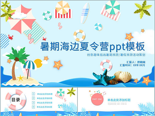 创意趣味插画风快乐暑假海边旅游夏令营策划PPT模板