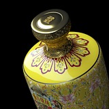 花穿枝烤金图案,象征着祥瑞。瓶型外轮廓采用仰视角度概括勾勒出瓶形特点,内部