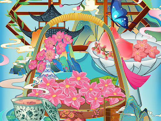 以高饱和度色彩为主调,搭配传统水墨晕染的效果,形成传统与现代的视觉碰撞。